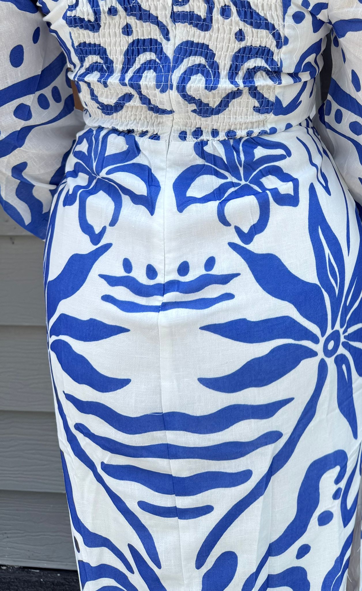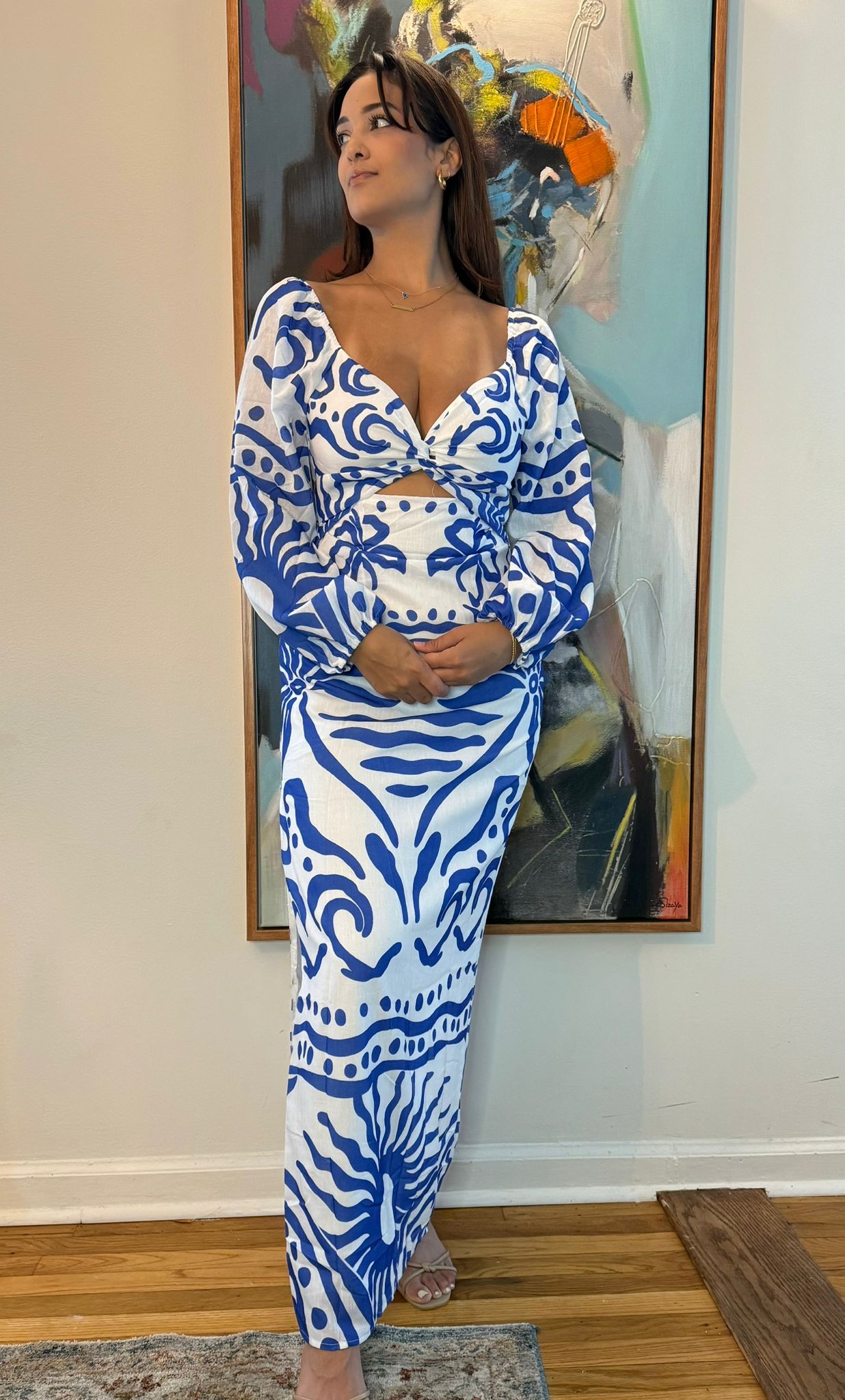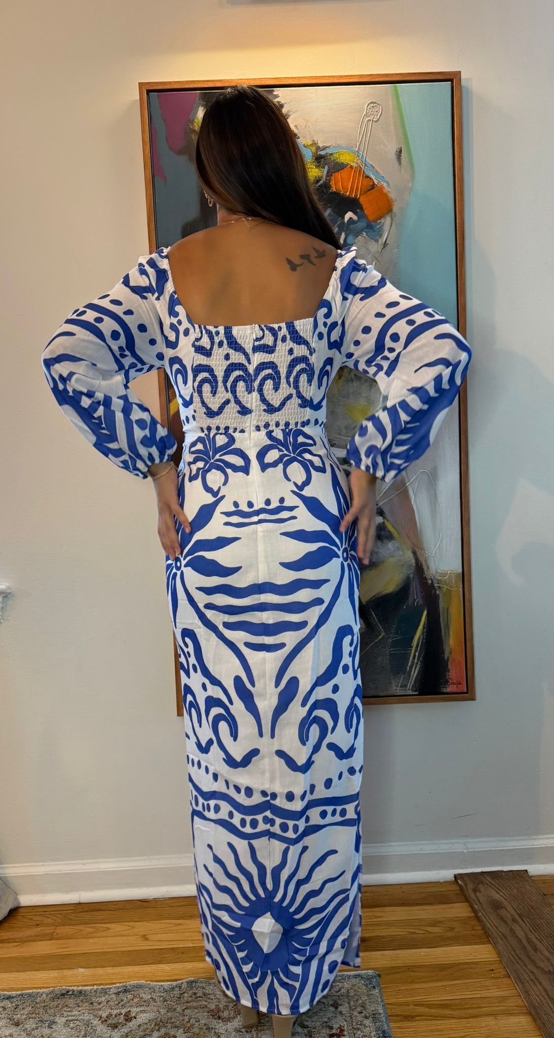 This eye-catching maxi dress features a bold blue and white abstract floral print, a plunging neckline with a twist-front detail, and a subtle front cutout. The long puff sleeves and side slit add elegance and movement, while the smocked back ensures a flattering, comfortable fit. Perfect for summer events or a chic vacation look.
